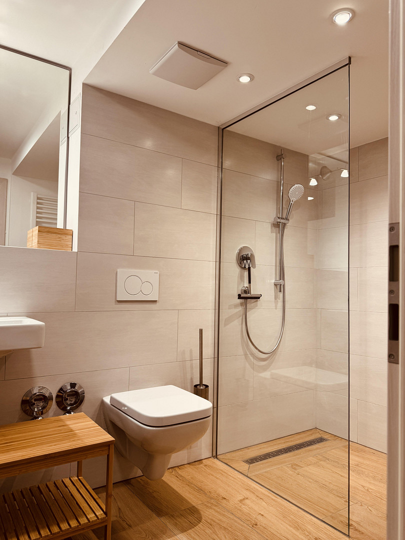 Bathroom: Tiled with a walk-in shower, toilet, and sink.