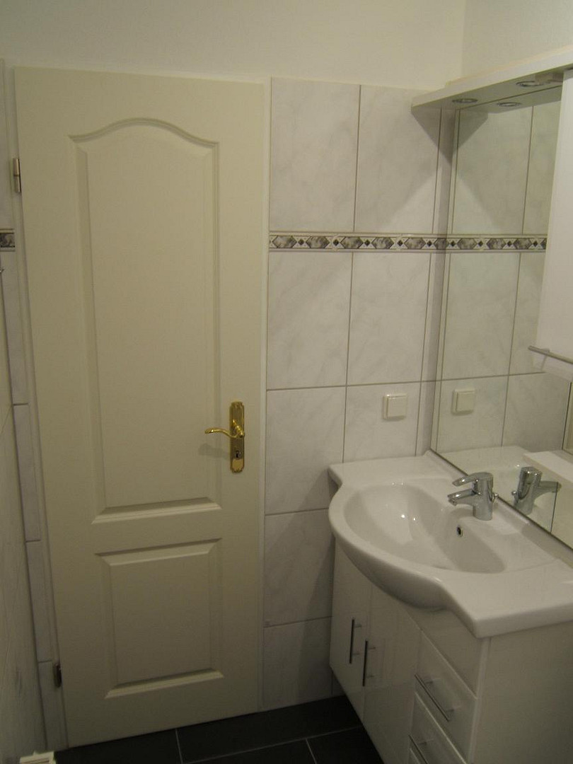 - Bad: Waschplatz mit großem Spiegel und Unterschrank.