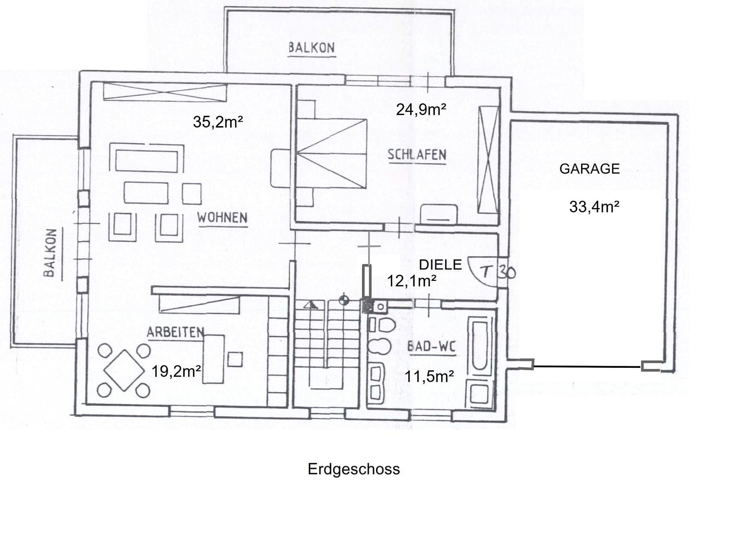 ERDGESCHOSS – 103 m² – Wohnzimmer, Arbeitszimmer, Schlafzimmer – Tageslichtbad mit Badewanne und Bidet – gefliestes Badezimmer und Flur – Teppichboden – 2 Balkone