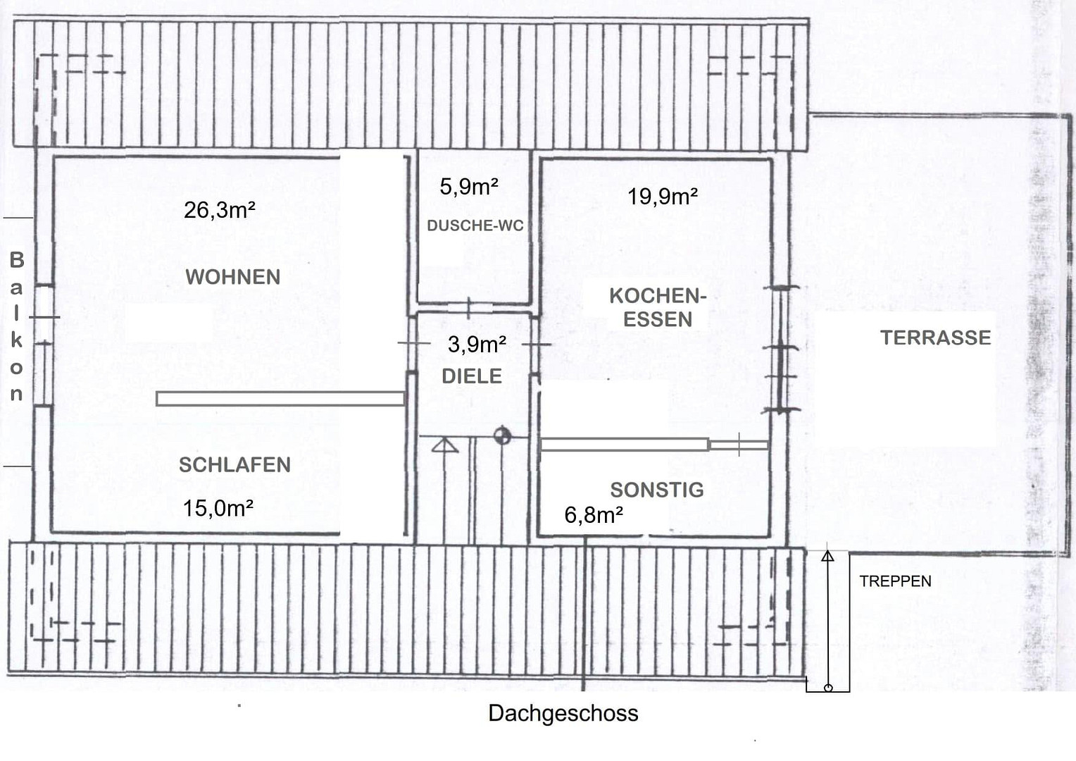 DACHGESCHOSS – 78 m² – Wohnzimmer, Schlafzimmer – Einbauküche mit Essbereich – Badezimmer mit Dusche und Tageslicht – Laminatboden – 32 m² große Dachterrasse und privater Balkon. Das DG kann über den Inneneingang als Familienbereich oder über den externen Zugang von der Dachterrasse als Einliegerwohnung genutzt werden. Die Wohnung wurde in den letzten 7 Jahren über Airbnb vermietet.