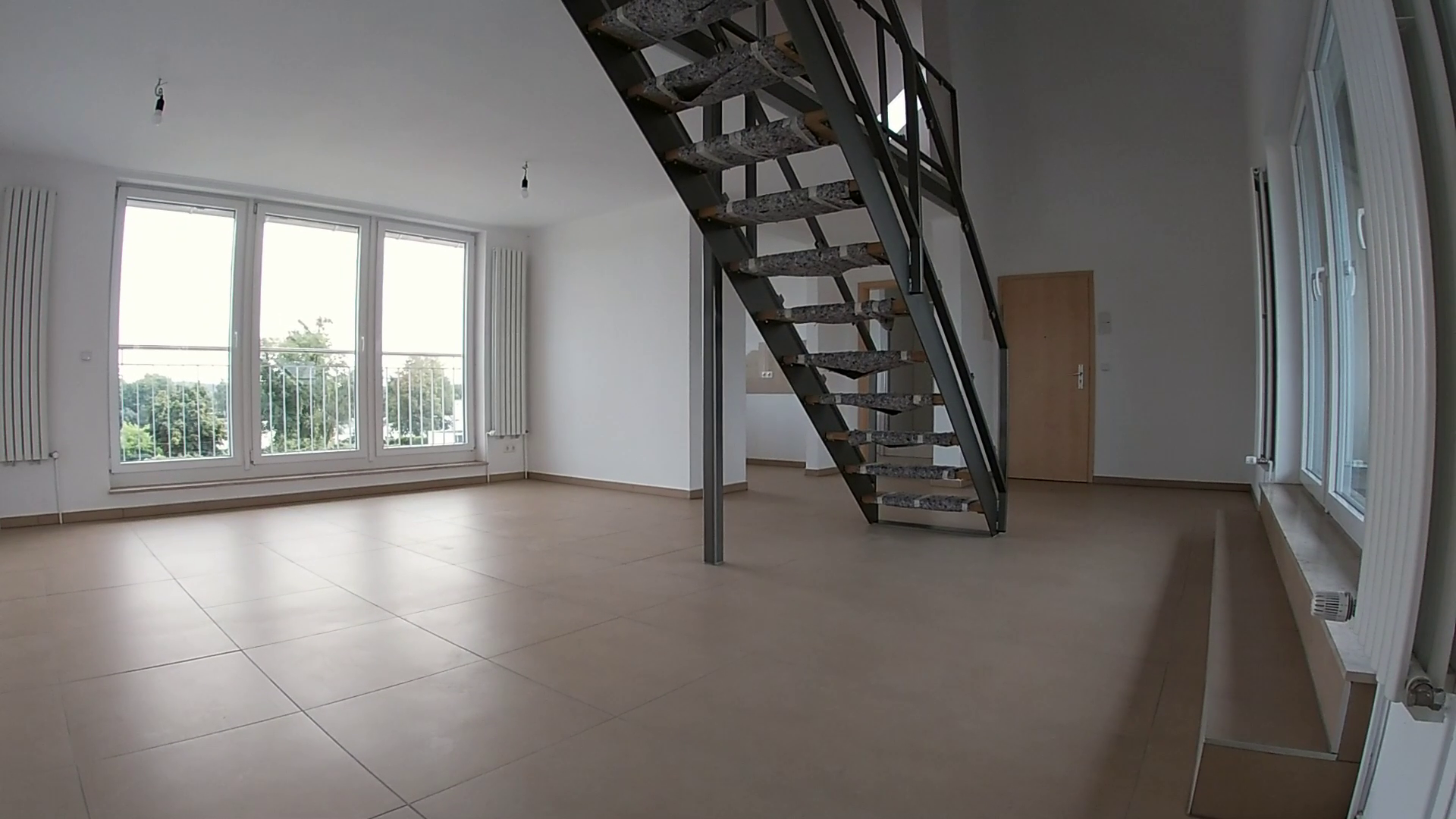 Die Wohnung Teilt sich in eine Galerie, welche durch die Kombination aus Stahl, Glas, Holz sowie ein hochwertiger Vinyl-Bodenbelag eine moderne Wohnatmosphäre schafft. Der Wohnbereich unterhalb der Galerie besticht durch große Fensterflächen sowie eine hochwertige, helle und große Bodenfliese welche für ein abrundendes warmes Wohngefühl sorgt.