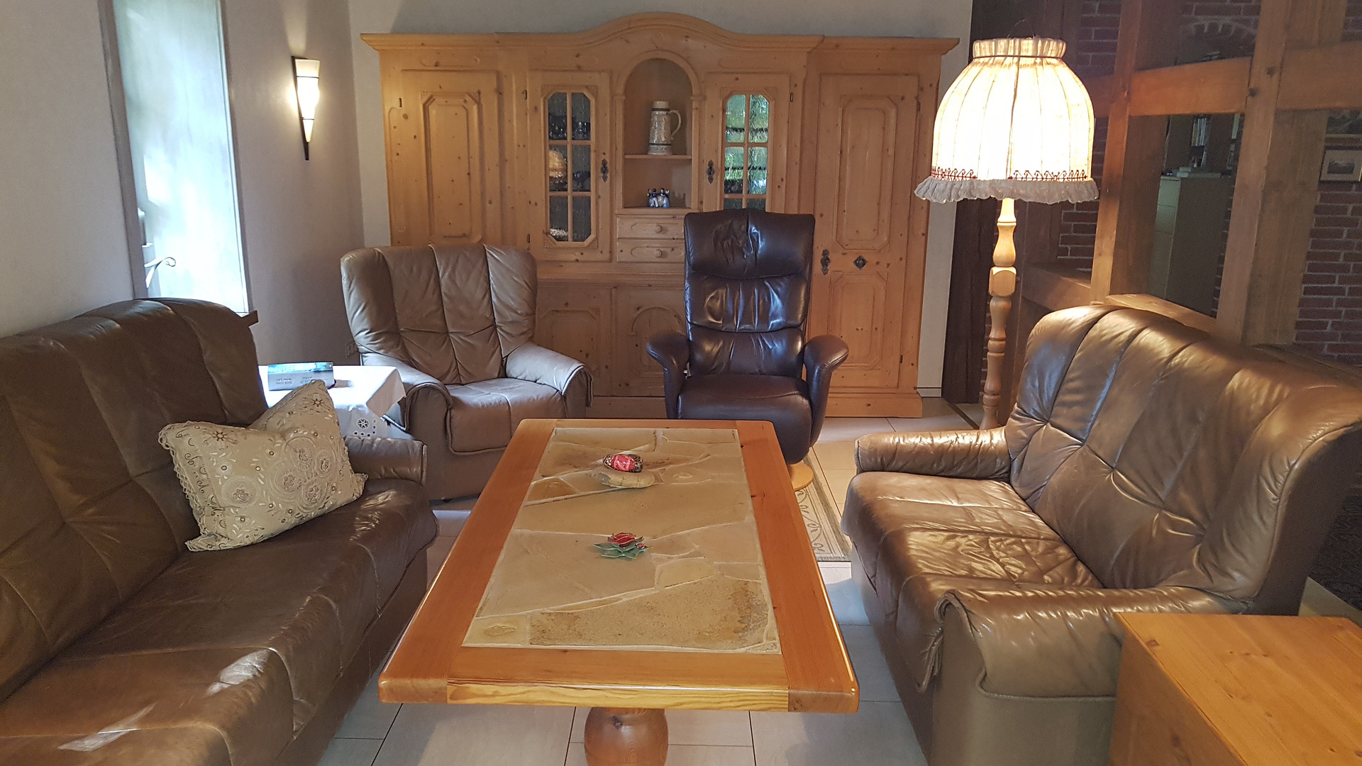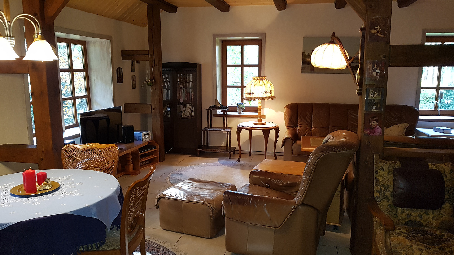 Das charmante Haus verfügt mit 7 Zimmern, 2 Bädern und einer sehr grossen Essdiele über viel Platz. Speziell die wohnliche Essdiele mit 3,5m Tisch für 12 Personen und offenem Kamin sowie Holztreppe bietet sich für gemütliche Runden geradezu an. Bemerkenswert sind auch die vielen sichtbaren Holzkonstruktionen, besonders die Höftständer. Entspannung pur verspricht der Aufenthalt in der Sitzmulde vor dem Stubenkaminfeuer oder aber die Nutzung der hauseigenen Sauna mit Tauchbecken und Schwalldusche.