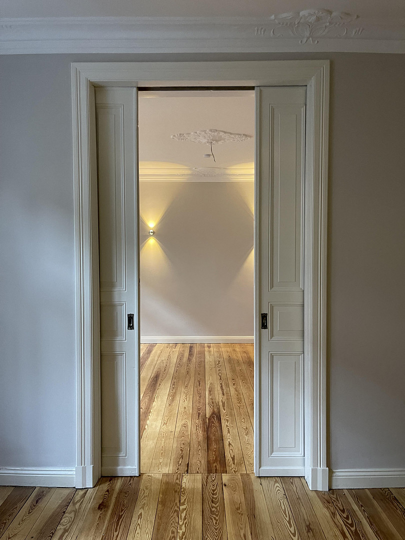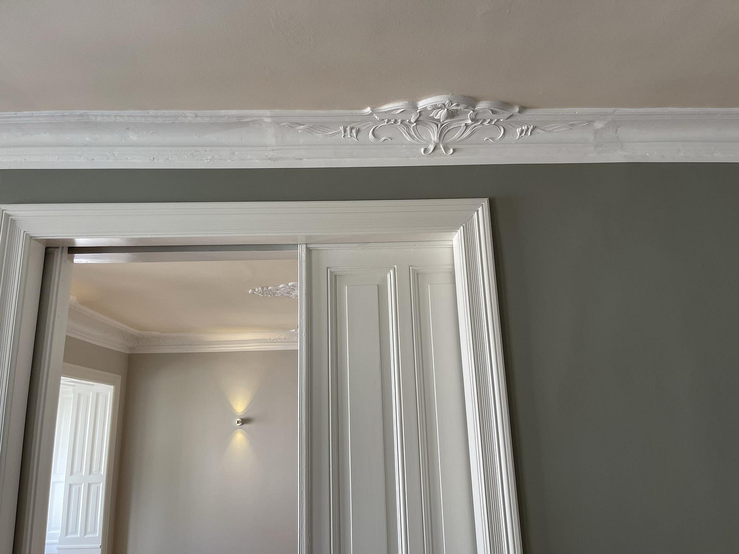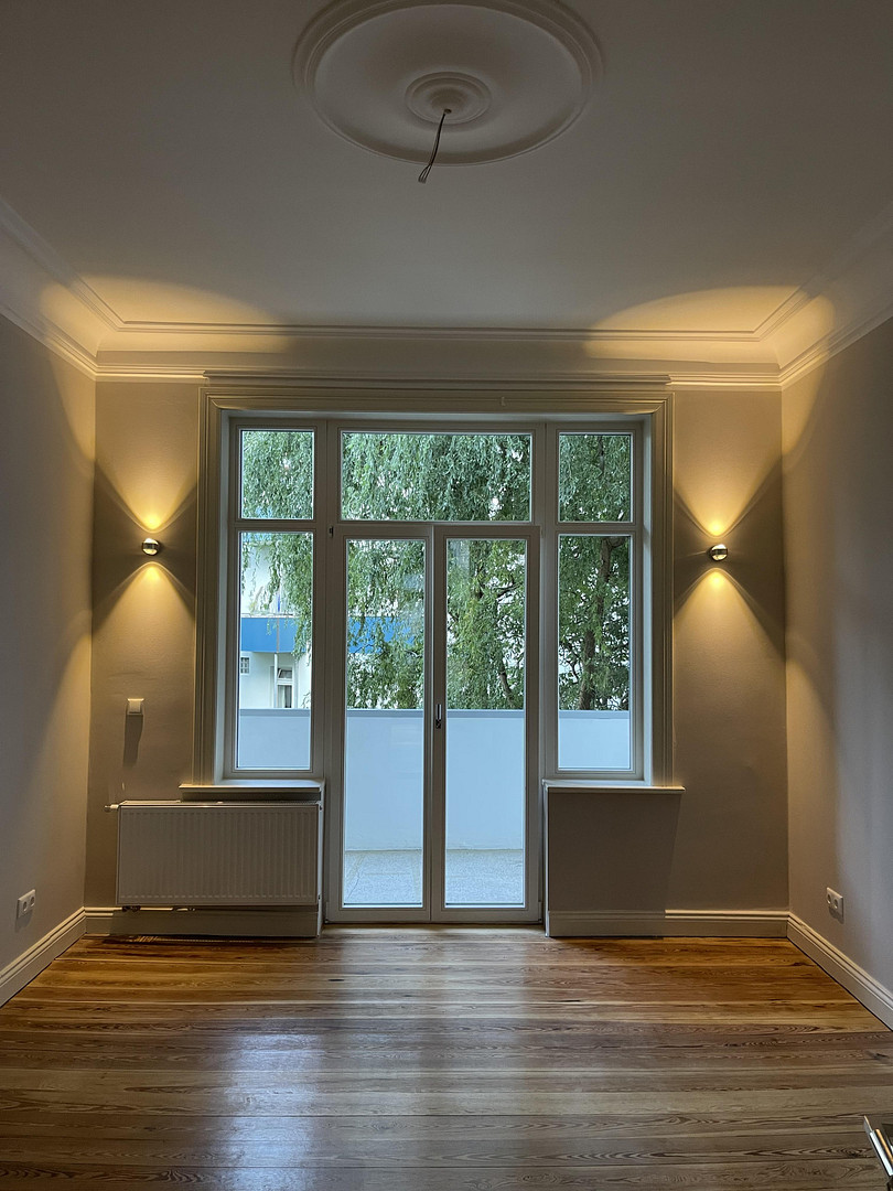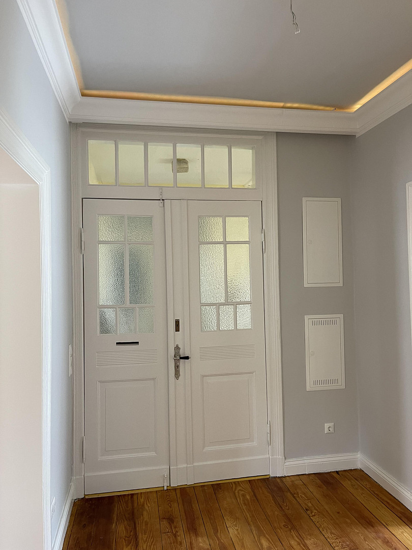 Die Wände wurden vollständig neu aufgebaut und mit einer eleganten Kombination aus originalgetreu restauriertem und neuem Stuck, hochwertigem Malervlies sowie natürlichen, atmungsaktiven mineralischen Farben gestaltet. Die Räume strahlen eine warme, ruhige und zugleich repräsentative Atmosphäre aus.
