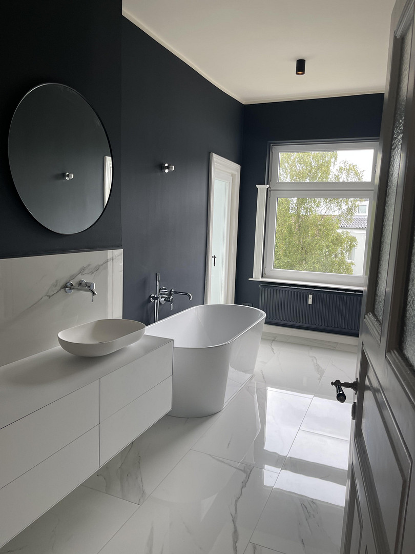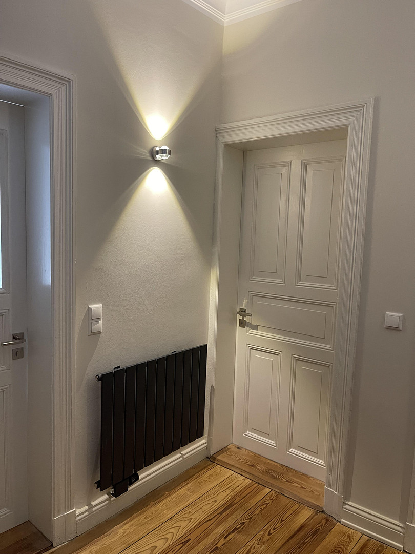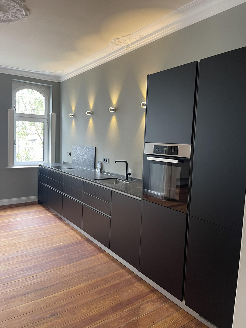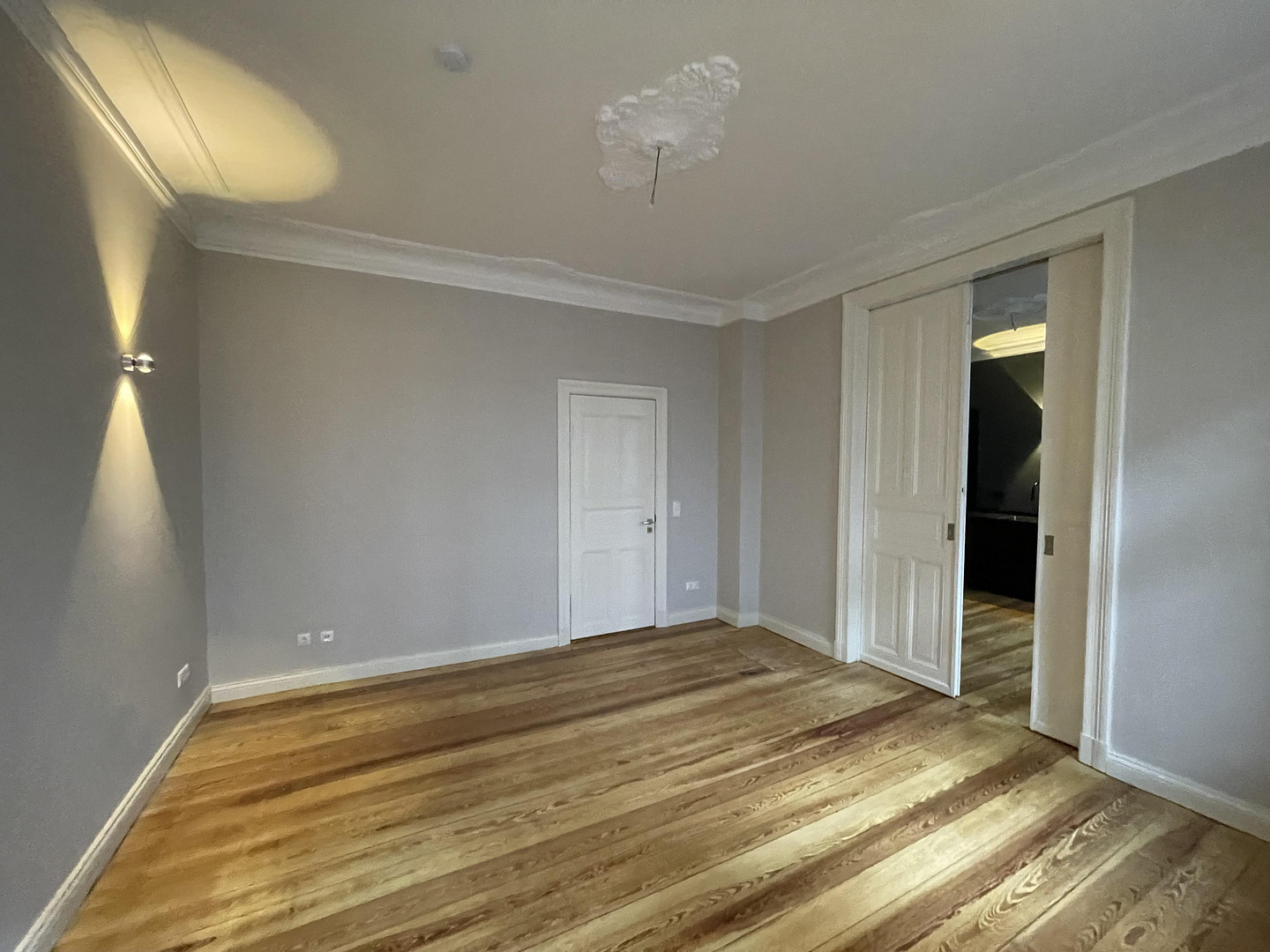 Die Wände wurden vollständig neu aufgebaut und mit einer eleganten Kombination aus originalgetreu restauriertem und neuem Stuck, hochwertigem Malervlies sowie natürlichen, atmungsaktiven mineralischen Farben gestaltet. Die Räume strahlen eine warme, ruhige und zugleich repräsentative Atmosphäre aus.