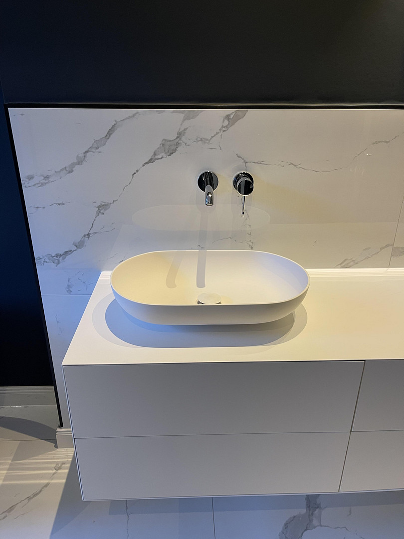 • ein 140 cm breites Gussmarmor-Waschbecken mit vier Schubladen