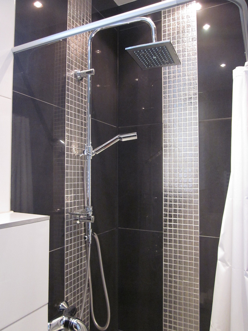 Tageslichtbadezimmer mit Dusche und Fußbodenheizung.