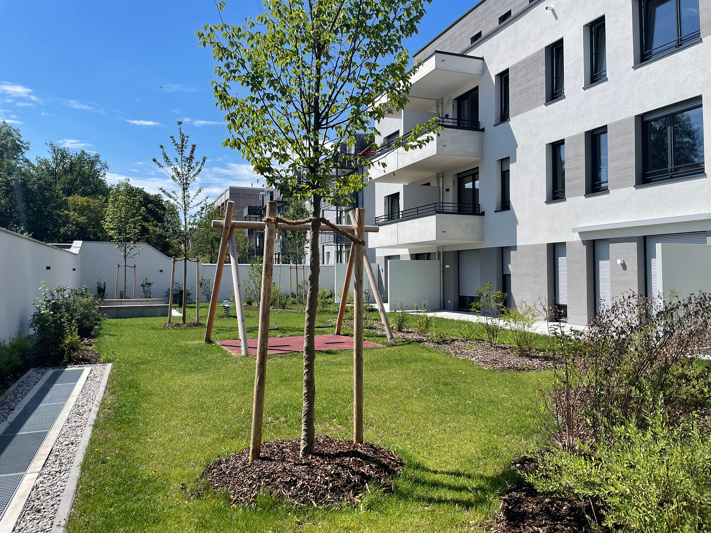 Alle Wohneinheiten sind mit Bodenheizungen, elektrischen Rollläden, hochwertigen Badezimmern und modernen Einbauküchen (inklusive Induktionskochfeld, Ofen, Spülmaschine, Kühl-/Gefrierschrank) ausgestattet. Die Deckenhöhe von 2,70 m sowie die großen Fenster erzeugen eine lichtdurchflutete und weitläufige Wohnatmosphäre, die durch die warme Eichenholzoptik des Fußbodens abgerundet wird. Die hiermit inserierte 2-Zimmer EG Wohnung zeichnet sich zudem durch einen ruhigen, überdachten Balkon zum Garten aus, auf dem Sie schon Ihr Frühstück bei Sonne genießen können.