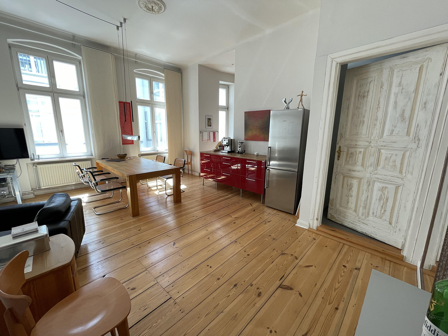 Die ursprünglich als 3-Zimmer-Wohnung konzipierte Einheit wurde mit viel Gespür für Großzügigkeit und Offenheit zu einer modernen 2-Zimmer-Wohnung umgestaltet. Durch das Zusammenlegen zweier Zimmer und das Öffnen des Flurbereichs entstand ein weitläufiger Wohnraum mit teiloffener Küche. Das Schlafzimmer ist ruhig und separat gelegen. Originale, abgezogene Holzdielen unterstreichen in Wohnräumen und Flur den klassischen Altbaucharakter.