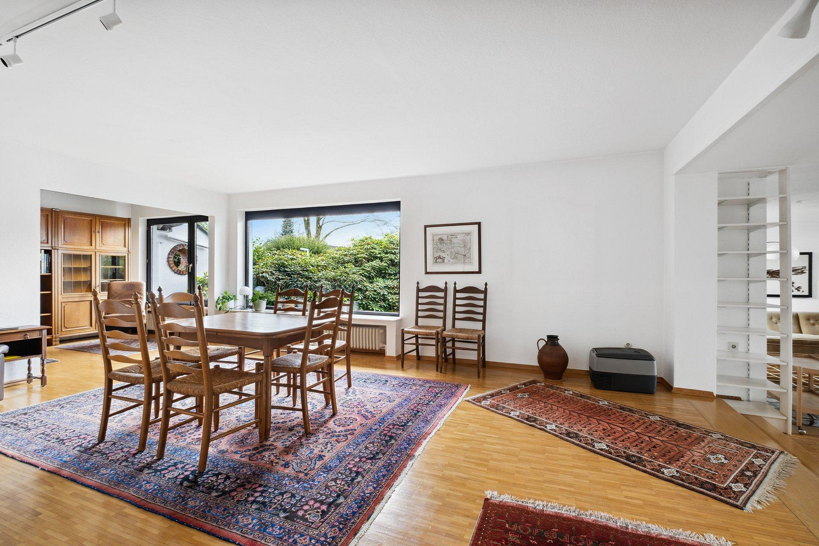 Die stilvolle Architektur und die charmante Ausstattungsqualität zeichnen dieses schöne Anwesen aus. Beim Betreten des Hauses gelangt man in einen Windfang. Durch eine Glastür geht es weiter in die großzügige Diele, von welcher rechts die Küche abgeht. Diese bietet durch ihre Größe und den Zugang zum Garten ein großzügiges Raumgefühl. Hier kann man sich in Ruhe und nach Herzenslust den kulinarischen Aktivitäten widmen. Das Herzstück, den Wohnbereich, betritt man weiter der Diele entlang. Der lichtdurchflutete Wohnraum beeindruckt mit einer mehr als vier Meter hohen Decke, die eine herrschaftliche Atmosphäre schafft. Zwischen Wohn- und Essbereich befindet sich eine gemütliche Kaminecke, die zum Verweilen einlädt. Im Erdgeschoss befinden sich außerdem ein Musik- oder Lesezimmer, ein Gäste-WC, ein Gästebad und eine Garderobe, die alle durch den hellen Flur verbunden sind.
