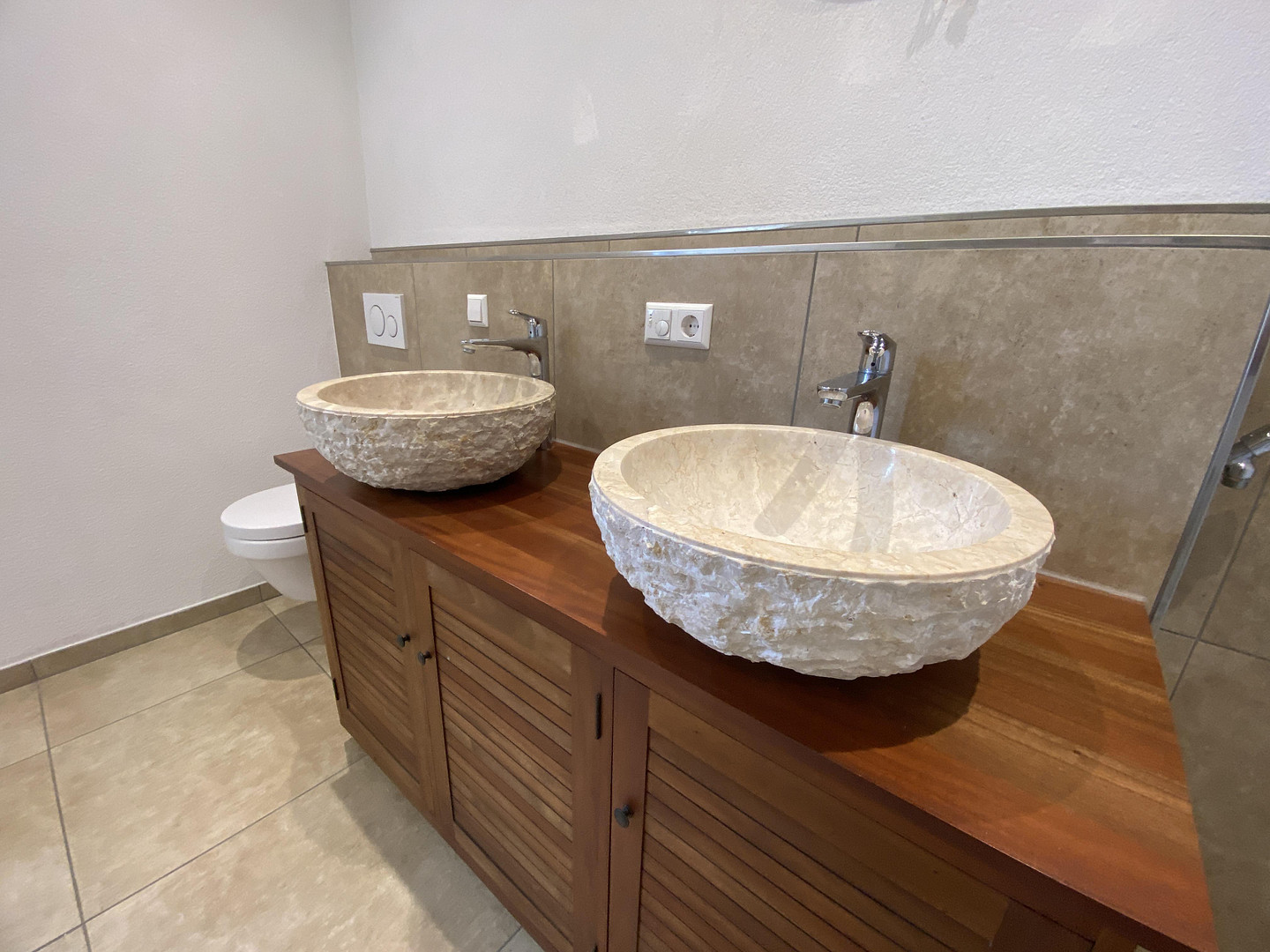 hochwertiges Badezimmer mit Naturstein-Waschbecken und Walk-In Dusche