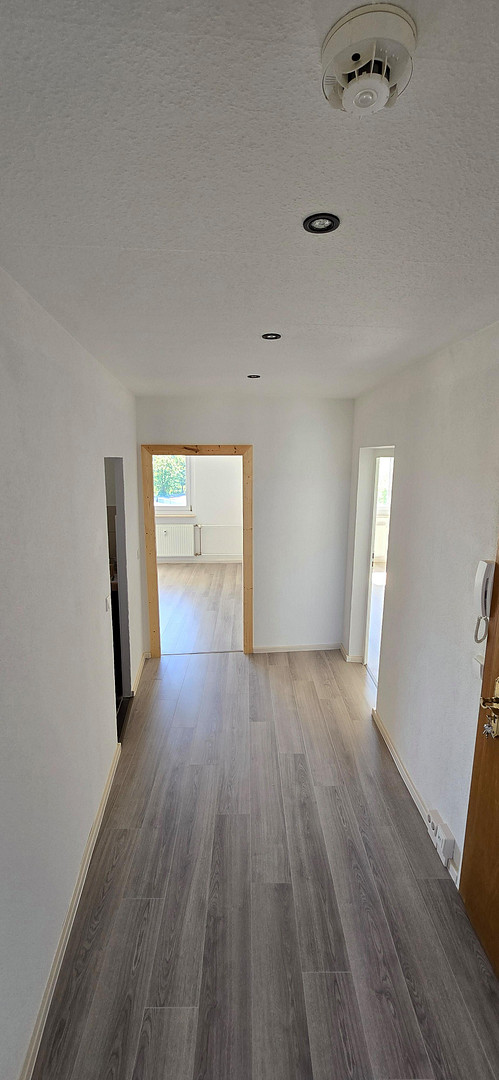 Beim Betreten der Wohnung gelangen Sie über das Treppenhaus in den großzügigen Flur, der reichlich Platz für Ihre Garderobe bietet. Von hier aus haben Sie Zugang zu allen Zimmern. Die abgehängte Decke ist mit modernen LED-Einbaustrahlern versehen, die für eine warme und einladende Atmosphäre sorgen.
