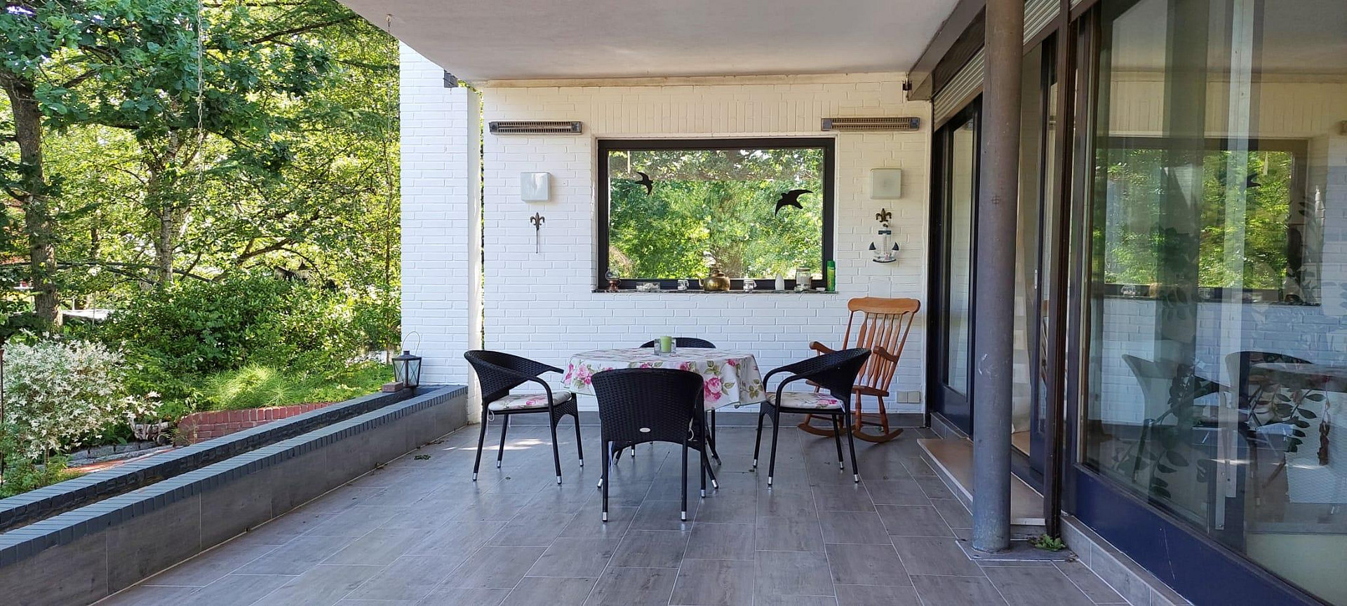 Aus dem Schlafzimmer und Wintergarten kommt man auf die nächste große, teilweise überdachte Terrasse.