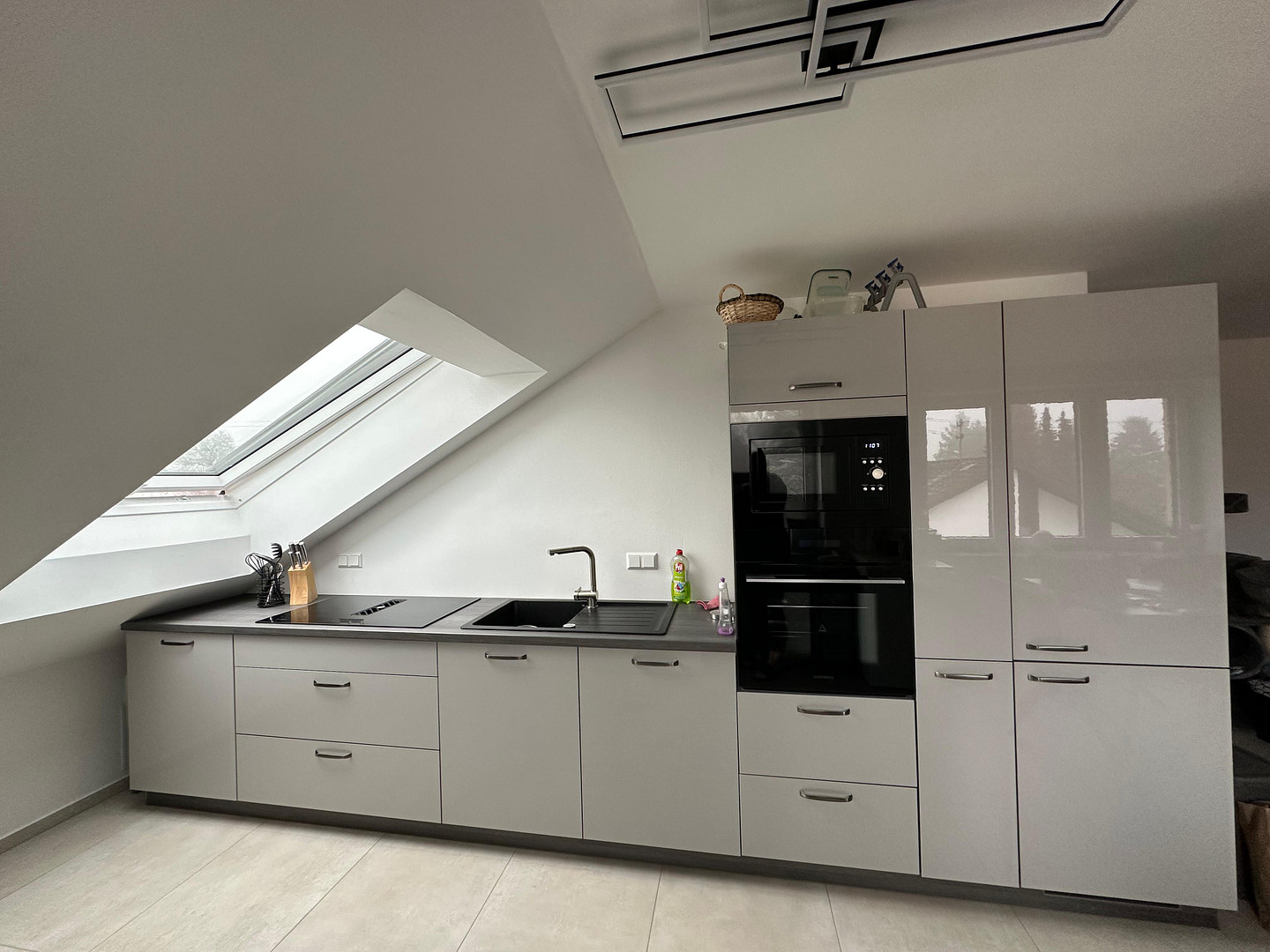 Die vorhandene Küche von Express Küche-Nolte Group (1,5 Jahre alt) kann den Vormietern abgeworben werden: sehr guter Zustand, Induktionskochfeld, integrierte Abzugshaube (Respekta), erhöhter Backofen (Respekta), Mikrowelle sowie einer großen Kühl-Gefrierkombination (Exquisit). Die Küche bietet außerdem viel Stauraum, eine großzügige Arbeitsflächen und einem Mülltrennsystem.