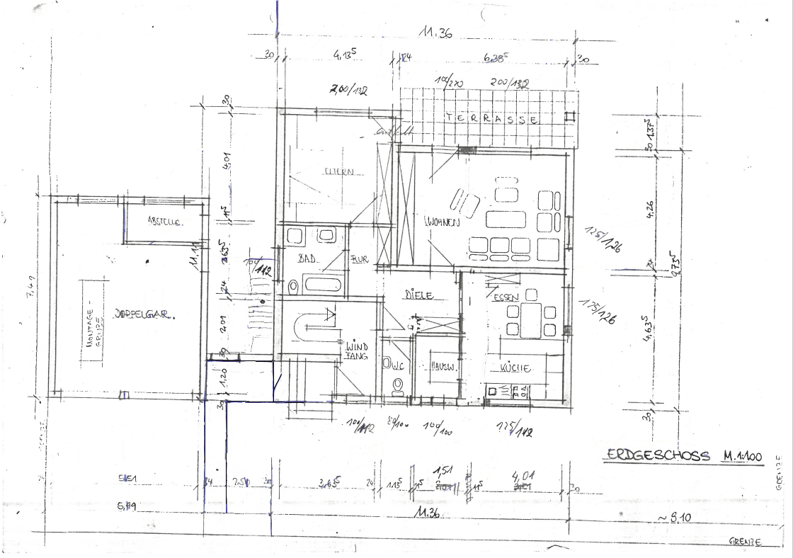 Im Erdgeschoss befinden sich die Küche mit Essbereich (inkl. Fußbodenheizung) und angrenzender Speisekammer, ein Wohnzimmer mit Zugang zur Terrasse und Garten, sowie ein großer Raum, der als Schlafzimmer oder Hobbyraum genutzt werden kann. Ein Bad und ein separates WC sind ebenfalls vorhanden.