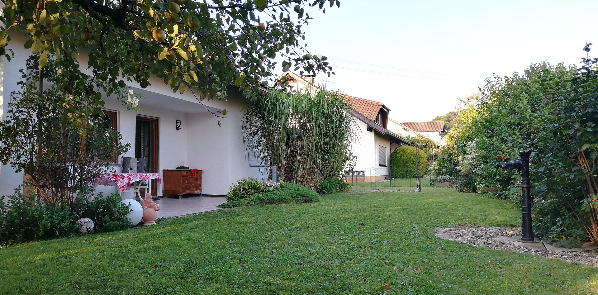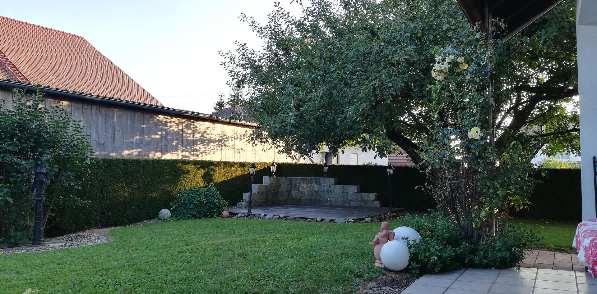 Auf dem Grundstück befinden sich eine Terrasse, eine separate Sonnenterrasse, eine Wasserhandpumpe (auch elektrisch nutzbar), ein Schuppen mit gepflastertem Stellplatz sowie ein Garten mit Blumen, Sträuchern und einem Apfel- und Birnbaum, die bequem bewässert werden können.