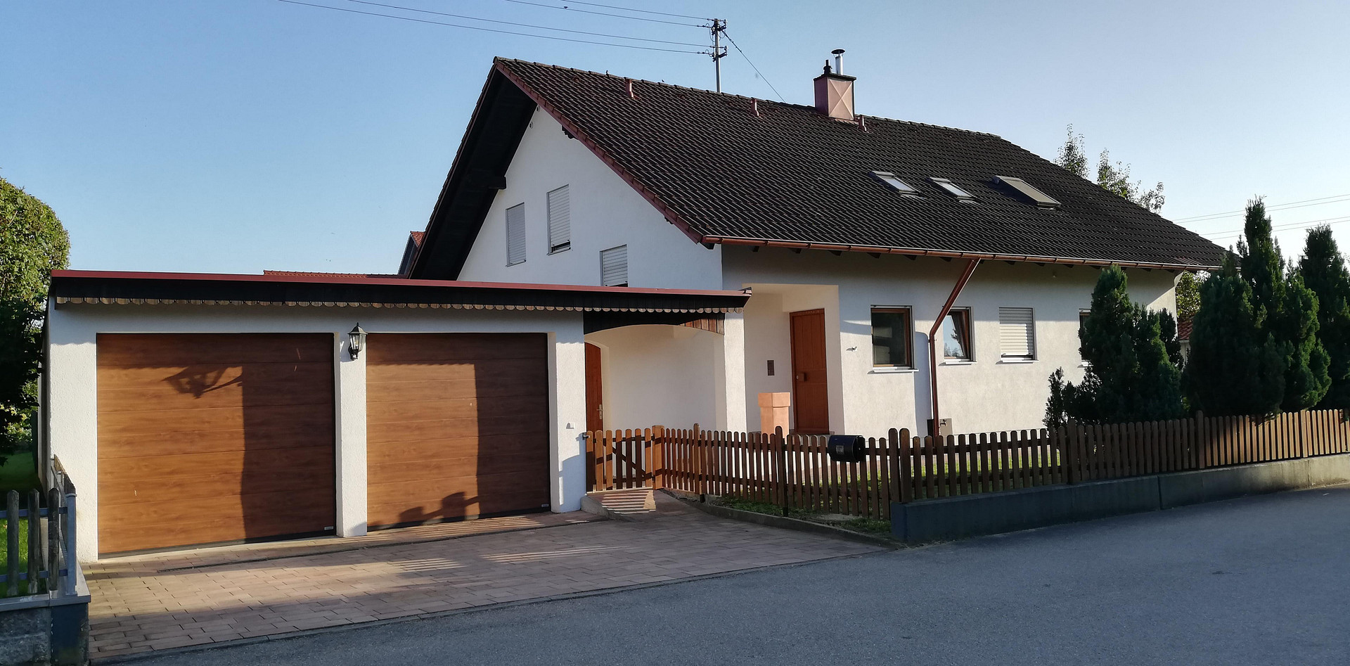 Die Doppelgarage ist von der Straße und über einen überdachten Flur zugänglich. 2018 wurden die Garagentore sowie die Pflastersteine im Hof und rund ums Haus erneuert.
