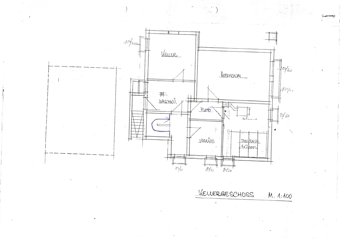 Der Keller ist über eine Treppe am Haupteingang zugänglich. Dort gibt es einen Waschraum (mit Zugang zur Garage), zwei Lagerräume, einen großen Hobbyraum und den Heizungsraum mit einer 2015 erneuerten Öl-Zentralheizung. Im Erdgeschoss ist außerdem ein Anschluss für einen Holzofen vorhanden.