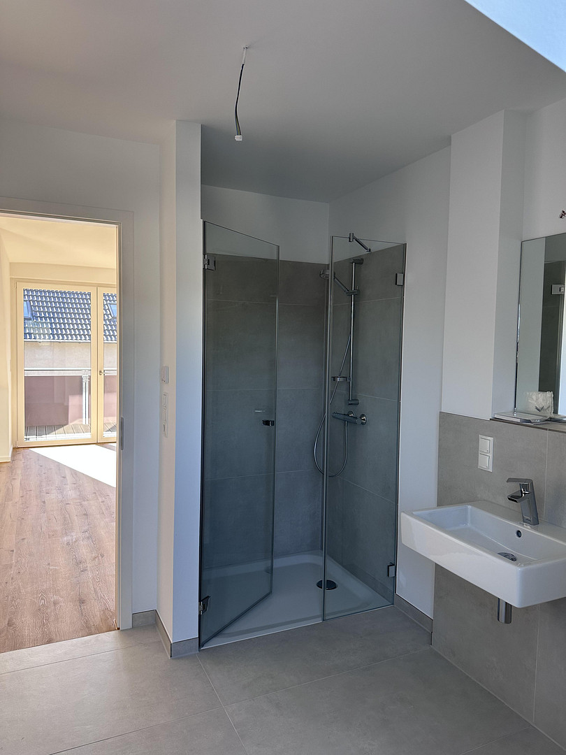 Das Tageslichtbadezimmer überzeugt mit großräumiger, ebenerdiger Dusche, Handtuchheizkörper, hochwertiger Sanitäreinrichtung und einem großen Spiegel.