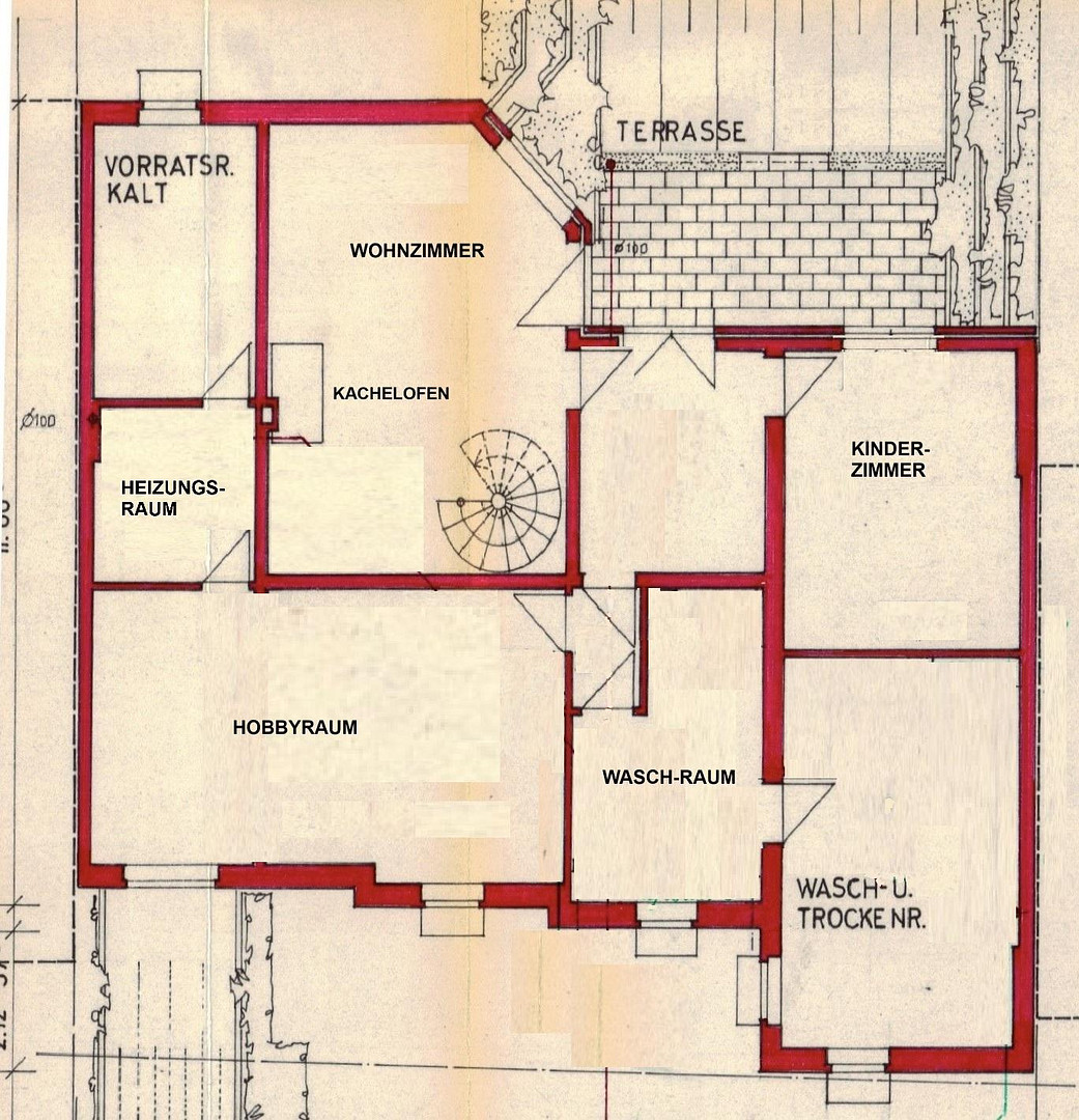 Zu der Hauptwohnung gehören im Erdgeschoss ein heller Eingangsbereich, das Wohnzimmer mit Kachelofen und Zugang zum Garten, drei Schlafzimmer, zwei Bäder sowie die Küche. Das große Badezimmer wurde vor wenigen Jahren modernisiert und verfügt über eine bodengleiche Dusche. Über eine Wendeltreppe gelangt man in das Souterrain. Das 2. Wohnzimmer verfügt ebenfalls über einen Kachelofen sowie über direkten Zugang zu einer weiteren Terrasse. Zudem befindet sich im Souterrain das 3. Kinderzimmer. Der Kellerbereich verfügt über 5 Räume, hierunter über einen ca. 33 m² großen Hobbyraum sowie über einen Saunaraum.