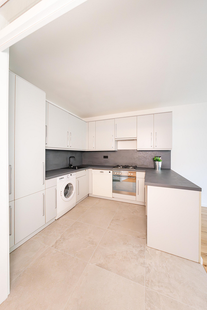 Die Einbauküche ist mit einer Spülmaschine, einem Gaskochfeld sowie einer Waschmaschine ausgestattet und bietet ausreichend Platz für gemeinsames Kochen.