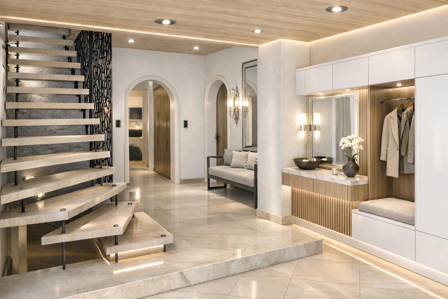 Das Anwesen beeindruckt bereits beim Betreten durch seine repräsentative Architektur und die hochwertige Massivbauweise. Großzügige Fensterfronten sorgen für lichtdurchflutete Räume und schaffen eine harmonische Verbindung zwischen Innen- und Außenbereich. Der offen gestaltete Wohn- und Essbereich bildet das Herzstück des Hauses und lädt sowohl zum entspannten Wohnen als auch zum stilvollen Empfangen von Gästen ein.