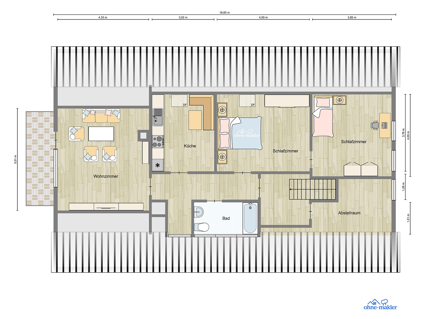 Die weiteren Böden im DG sind mit Laminat ausgestattet. Schauen Sie durch die großen Veluxfenster direkt in den Himmel. Oder verbringen Sie einige freie Stunden auf dem Balkon.