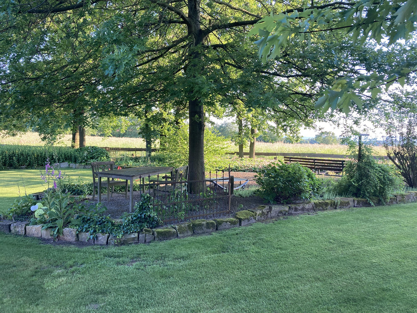 Das Grundstück ist in leichter Hanglage u. ca. 500m vom Wald entfernt. Das Grundstück, mit unverbautem Weitblick, ist eingezäunt u. parkähnlich angelegt. Neuer u. alter Baumbestand.