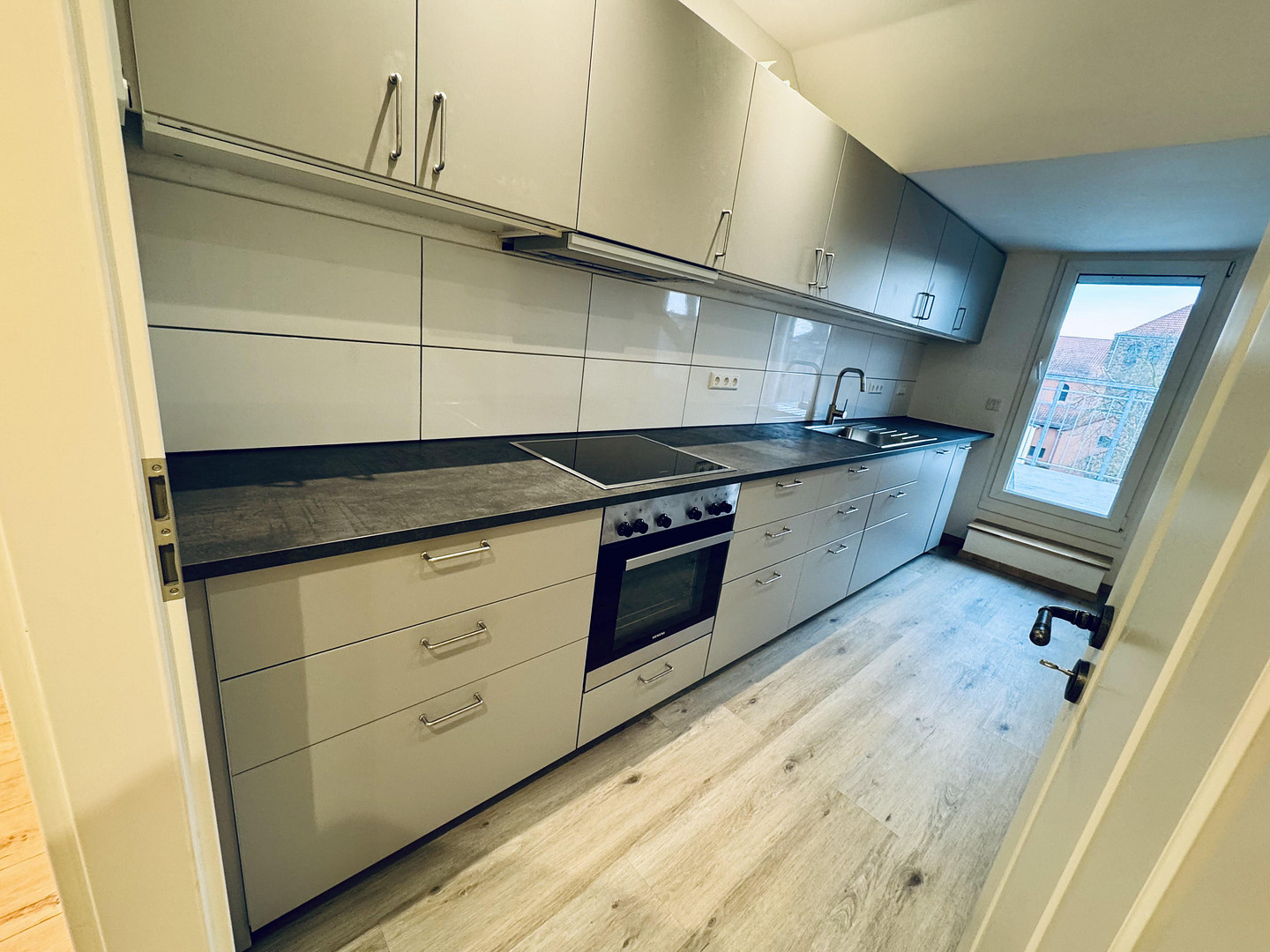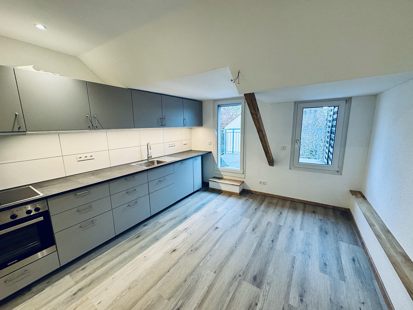 Sanierter gedämmter Altbau. Neue Marken Einbauküche, neue Merken Elektrogeräte (Neff, Siemens), modernes neues Badezimmer mit großer offener Dusche, großzügige Dachterrasse (ca. 18 m²), Ca. 2,80 m Raumhöhe, kaum Dachschrägen. Laminat, Fliesen, Altbauflair, hohe Decken, freiliegende Holzbalken.