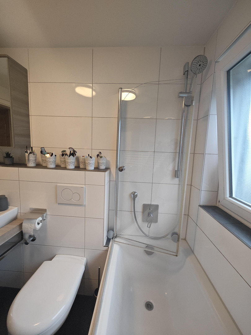 Das moderne Badezimmer 🛁 bietet eine Badewanne mit Duschmöglichkeit und Toilette – ideal, um nach einem langen Lerntag einfach mal abzuschalten 😌.