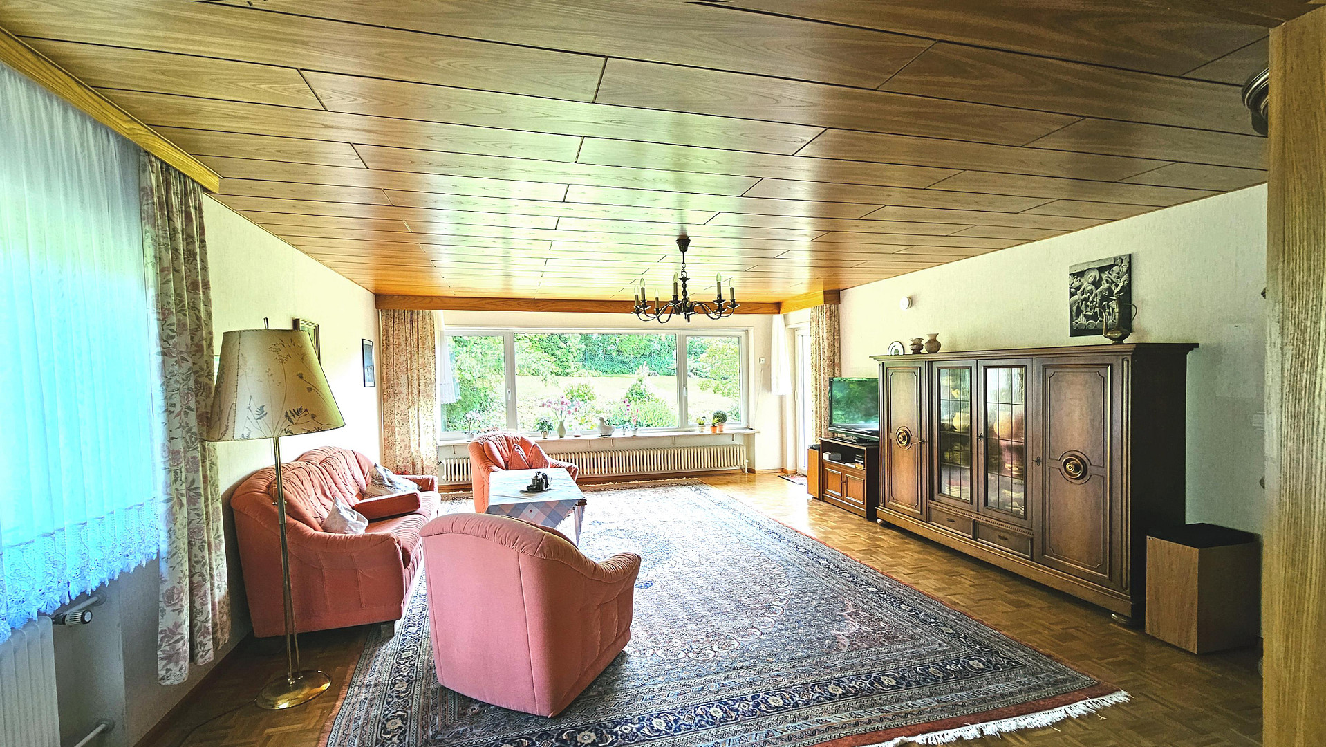 Nach links, vorbei an einer Garderobennische geht es in die Küche und weiter in das ca. 50 m² große Wohn-Esszimmer, in dem ein großes Blumenfenster einen herrlichen Blick in den Garten ermöglicht.