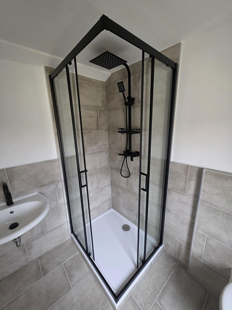 Ausgestattet mit einer großzügigen Regendusche, anthrazitfarbenen Armaturen, moderner Glasduschkabine und zeitlosen Fliesen – stilvoll, hochwertig und absolut zeitgemäß.