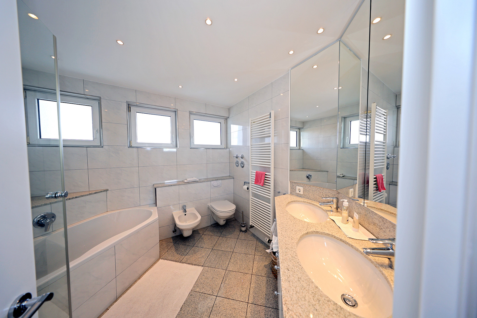 -Tageslichtbad mit Echtglasdusche und separater Eckbadewanne, Doppel-Granit-Waschtisch mit Unterschrank, WC, Bidet, Spielschrank und Handtuchheizkörper (individueller Bad-Ausbau)