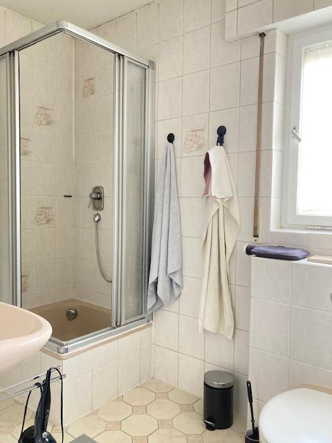 Das Tageslichtbad mit Dusche, Waschbecken und WC ist raumhoch gefliest.