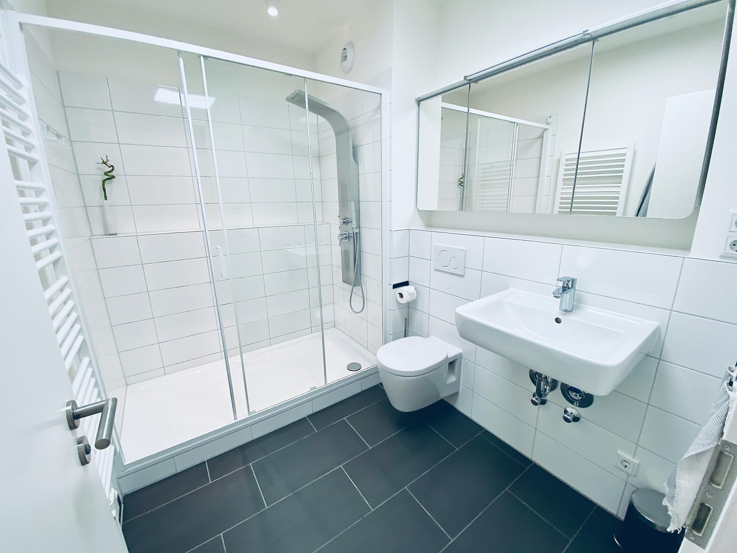 Lassen Sie sich vom stilvollen Bad mit großformatigen, anthraziten Bodenfliesen und weißen Wandfliesen begeistern. Es überzeugen zudem eine XXL Dusche mit einem Edelstahl Duschpaneel inkl. Massagedüsen, moderne Armaturen sowie ein Handtuchheizkörper und weitere namhafte Sanitärobjekte.
