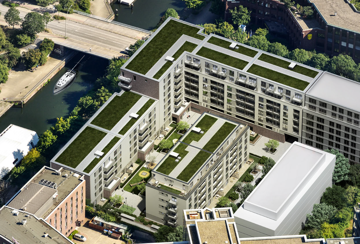 Citynaher Neubau in hervorragender Lage: Der Nagelsweg 24 befindet sich direkt an der Uferpromenade der City Süd, umgeben von mehreren Wasserkanälen. Die Umgebung kombiniert urbanes Stadtleben mit modernen Grün- und Wasserflächen.