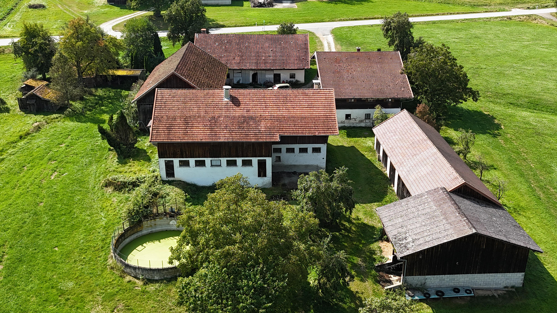 Das Gebäudeensemble umfasst neben dem Wohnhaus eine landwirtschaftliche Scheune (Stadel) und weitere Nebengebäude. Die Gesamtgröße des Grundstücks beträgt 19.865 m² und bietet vielfältige Nutzungsmöglichkeiten, beispielsweise Gartenbau, Tierhaltung oder ruhiges Wohnen mit großzügigen Freiflächen. Durch die Südausrichtung des Wohnhauses sowie die offene Lage inmitten von Wiesen und Feldern entsteht eine helle, ruhige und naturnahe Wohnatmosphäre.