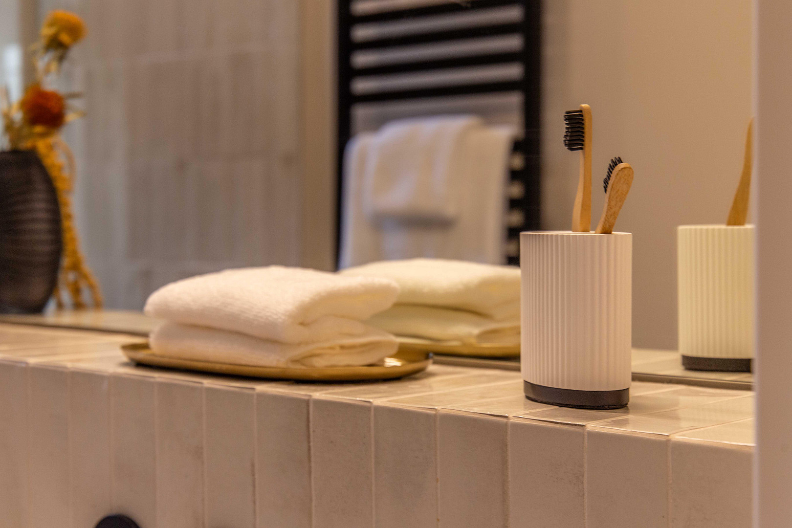 • Luxuriöses Bad: Walk-in-Dusche, Hansgrohe-System, LAUFEN-Waschtisch, Wand-WC, Zementfliesen & schwarze Armaturen
