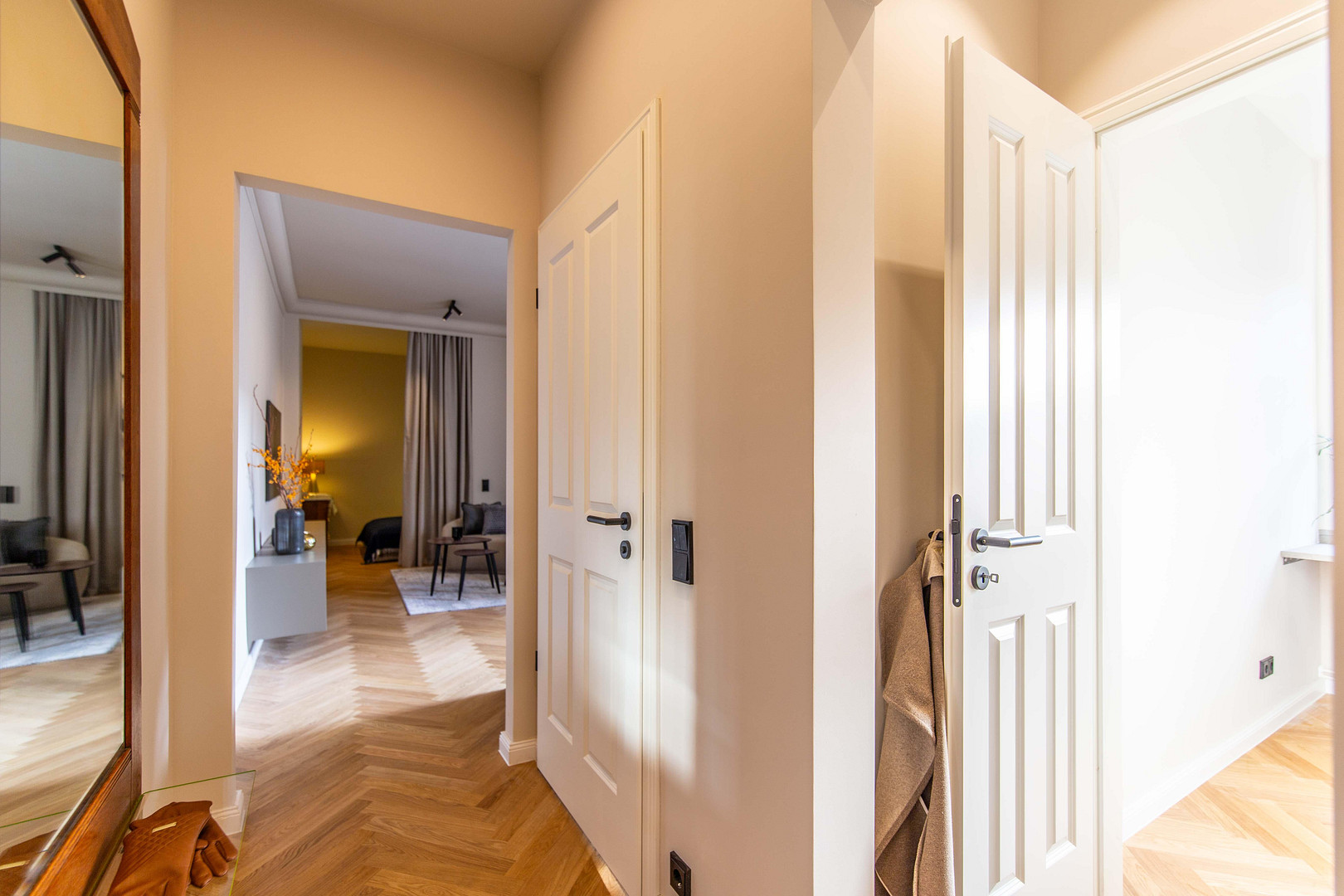 • Hochwertige Holztüren mit schwarzen Beschlägen