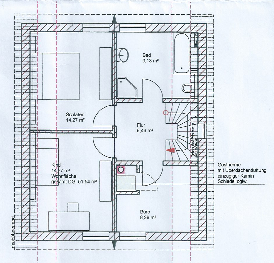 Im Obergeschoss des Hauses befinden sich Elternschlafzimmer, ein Kinderzimmer und ein Büro, sowie das Badezimmer mit Badewanne, großer Dusche und Doppelwaschtisch.