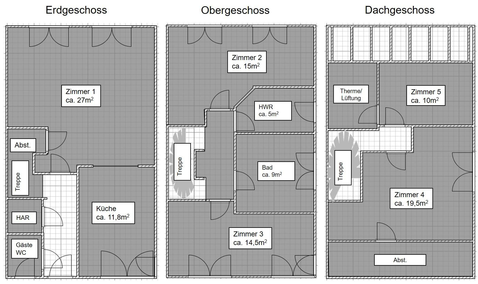 Hinweis: Detaillierte Informationen zu Raumgrößen und Aufteilung finden Sie in den beigefügten Schnitt- und Grundrisszeichnungen (siehe Bildergalerie). Diese zeigen die Gestaltung und Dimensionen der einzelnen Etagen im Überblick.