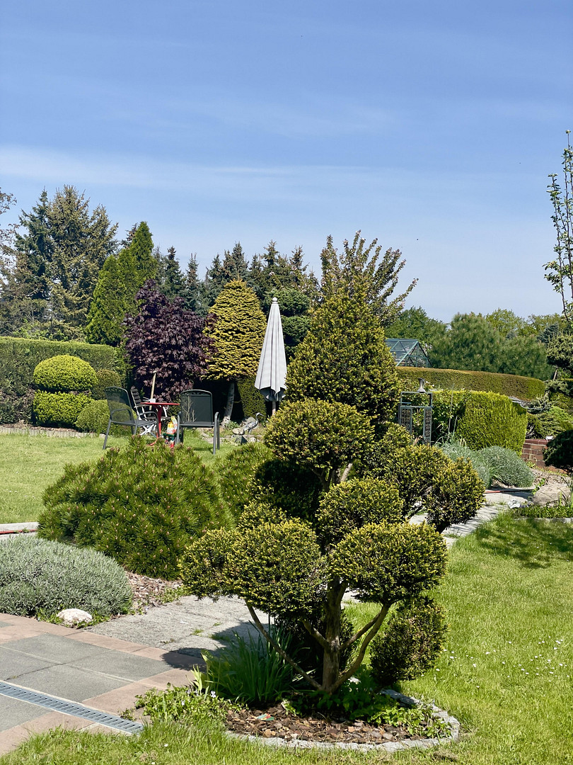 Der große Garten mit Teich und pflegeleichten Laub- und Nadelgehölzen bietet viel Platz zur Entspannung und freien Gestaltung.