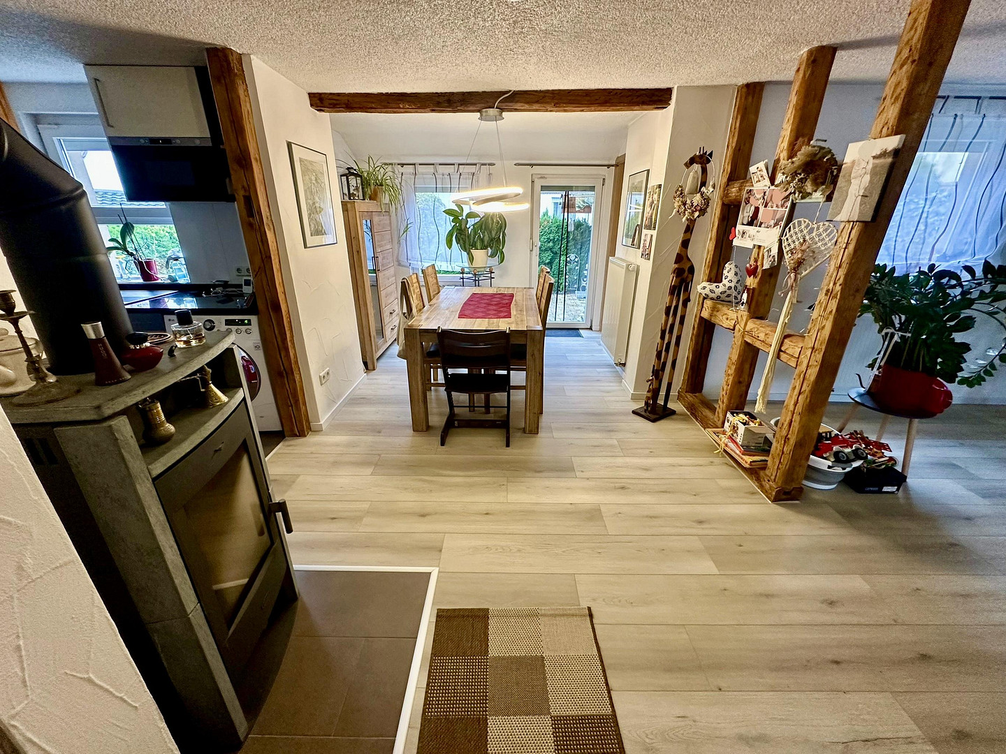 •Großzügiger Wohn- und Essbereich mit neuem Vinylboden (2025) und rustikalen Holzbalken