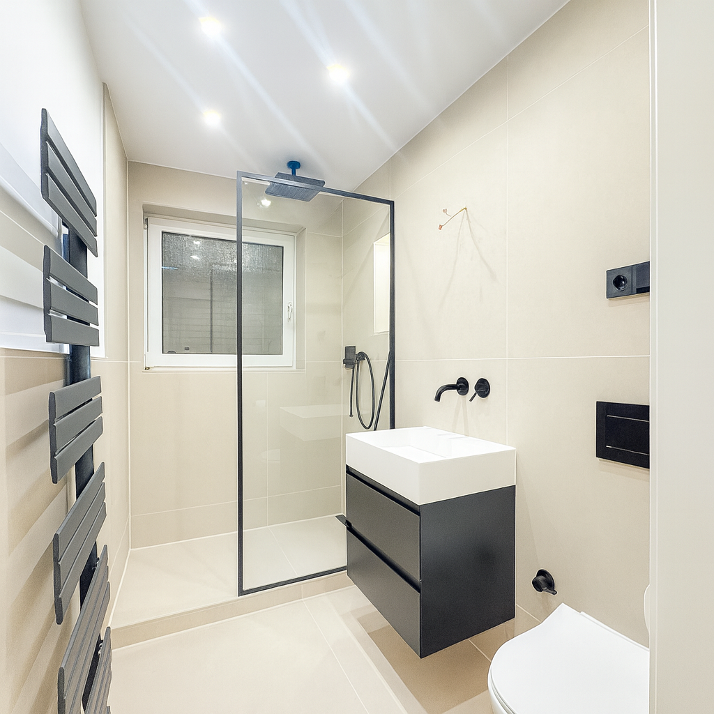 -Tageslichtbad mit bodentiefer Dusche und schwarzen Designarmaturen