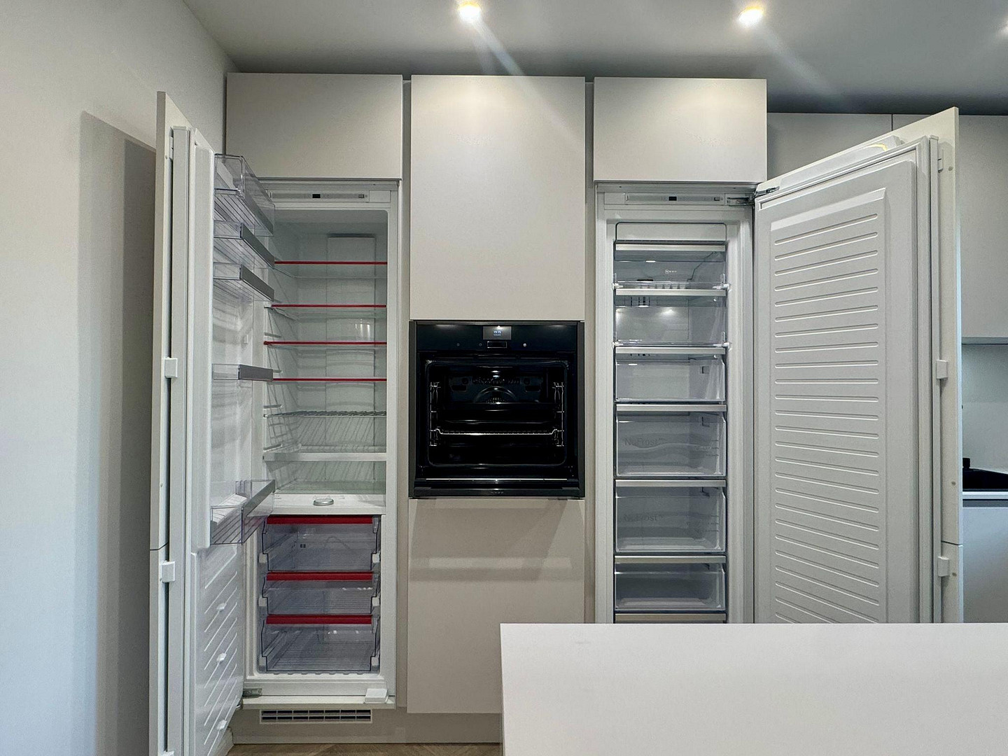 Beleuchtung und großer Kochinsel, Hochwertige NEFF-Geräte (Induktionskochfeld mit integriertem Abzug, Backofen, Geschirrspüler, separater Kühlschrank & Gefrierschrank)