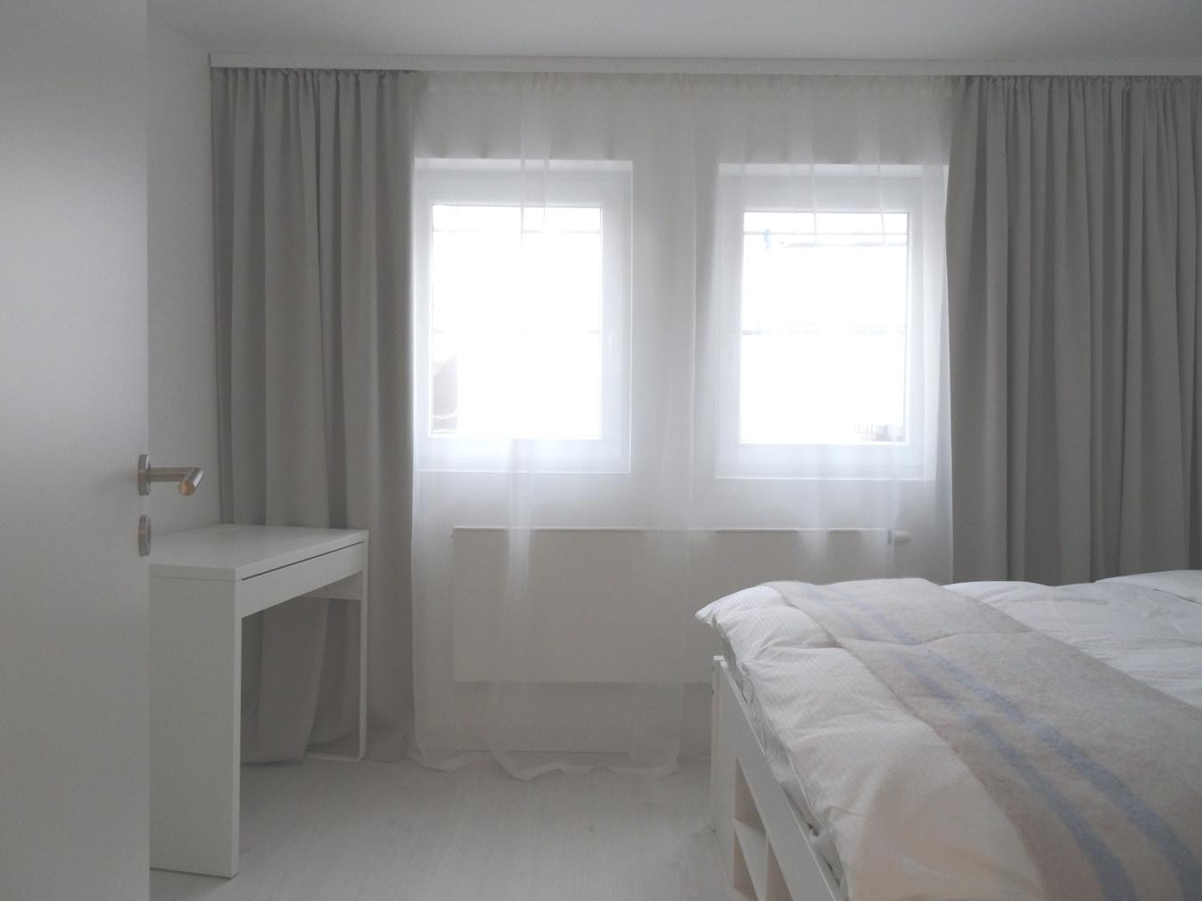 Das ruhige Schlafzimmer ist ausgestattet mit einem 160 x 200 cm großen Bett und einem Einbau-Kleiderschank.