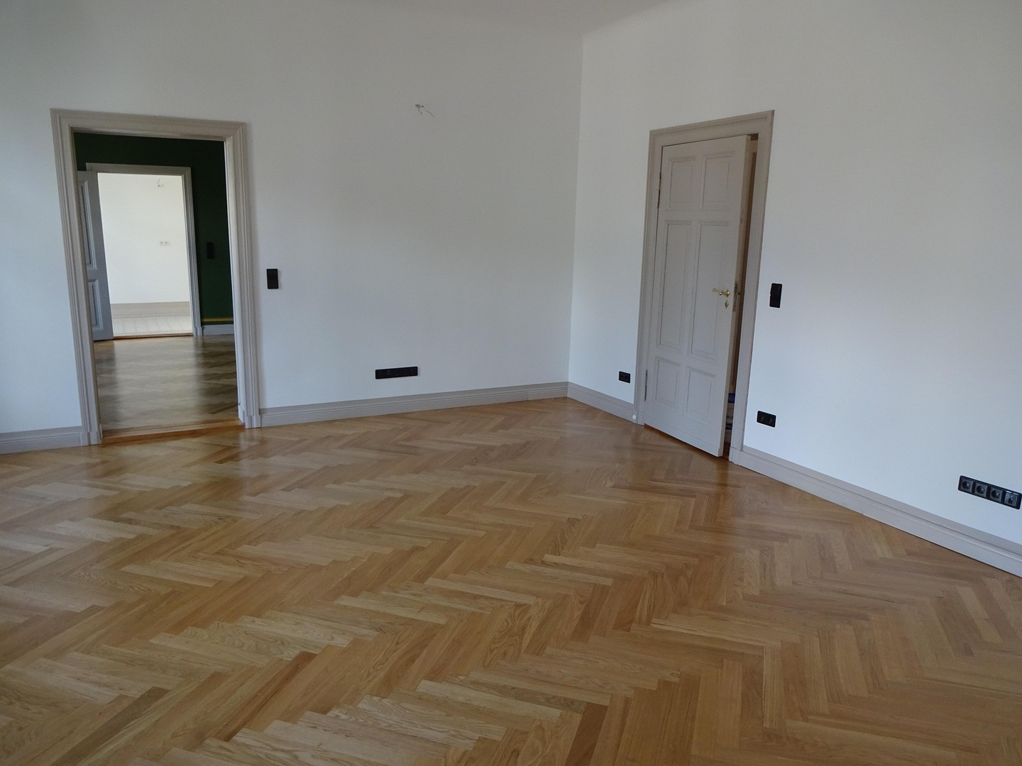 Die gesamte Etage im 1. Obergeschoss, umfassend ca. 173,80 m² , wurde 2021 umfassend und hochwertig kernsaniert. Hier verbindet sich der unvergleichliche Charme des Altbaus mit dem Komfort einer neuwertigen und technologisch fortschrittlichen Ausstattung. Großzügige, lichtdurchflutete Räume inszeniert durch historische Flügeltüren und edle Schlossdielen. Dies schafft ein Ambiente, das Kunden und Mitarbeiter gleichermaßen inspiriert. Trotz des historischen Flairs ist die Einheit modern vernetzt. Die komplette Cat 7 DV-Verkabelung und moderne Schallschutzfenster garantieren effizientes Arbeiten in Ruhe. Ein hochwertiges Wannenbad mit zusätzlicher Dusche und ein separates Gäste-WC runden das Bild der gehobenen Ausstattung ab. Ein privater Süd-Balkon lädt zum Verweilen ein.