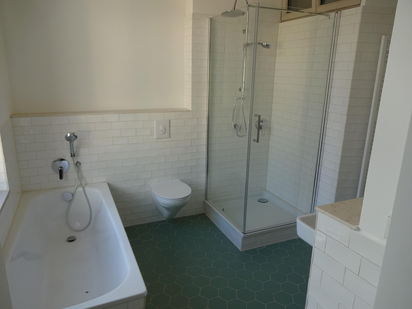 Gehobene Qualität: Hochwertiges Bad mit Badewanne und zusätzlicher Duschkabine plus separates Gäste-WC.