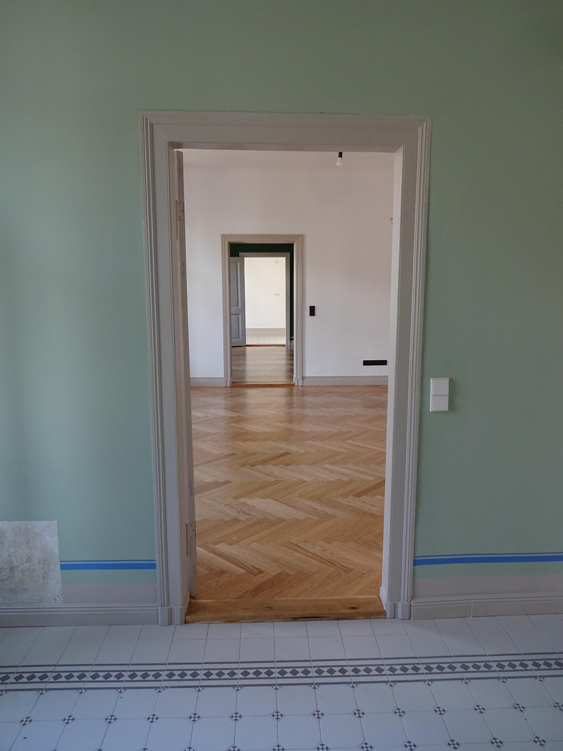 Repräsentatives Ambiente: Großzügige Räume mit historischen Schlossdielen und Flügeltüren.
