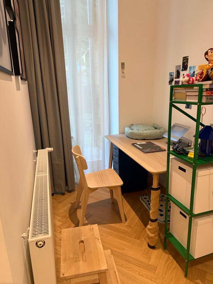 Fully refurbished three years ago, this terrace-level Altbau apartment blends historic charm with contemporary comfort. The 5 m² terrace faces a quiet, green courtyard, while the spacious living and dining area with open kitchen benefits from bright southeast exposure. Electric shutters allow complete blackout whenever desired.