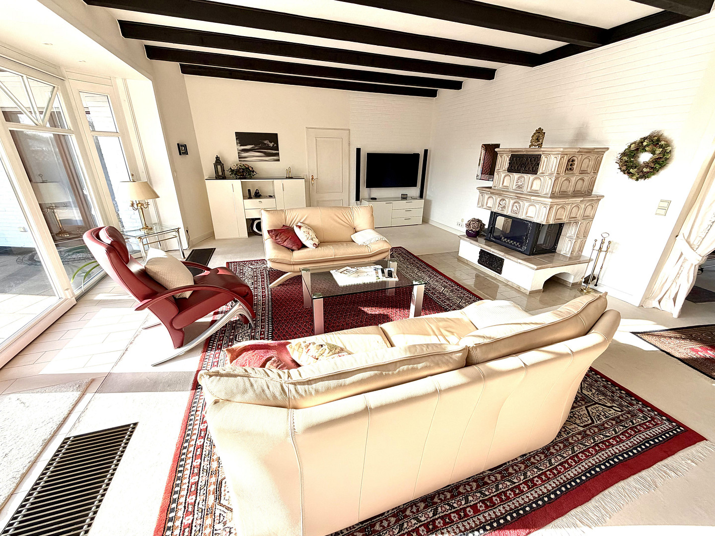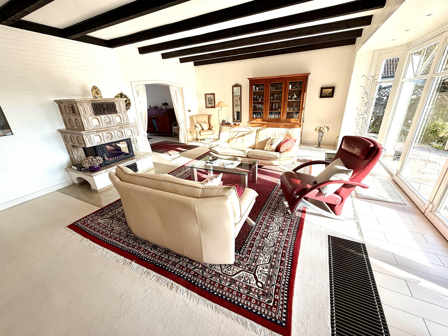 Durch Abtrennung vom Schlafzimmer 1 besteht die Möglichkeit ein zusätzlichen Raum im Schlaftrakt zu schaffen. Über einen ansprechenden Eingangsbereich, mit angrenzendem Gäste-WC, gelangen Sie in das Wohnzimmer mit Zugang zu der teilweise überdachten Süd-West-Terrasse. Dunkle Holzbalken, Downlights sowie der Kachelofen mit edlen Verzierungen verleihen diesem Bereich seinen besonderen Charme. Die Heizkörper im Wohn- Essbereich sind im Fußboden versenkt. Ein Durchbruch verbindet das Wohnzimmer mit dem Esszimmer, an welches sich der massiv erbaute Wintergarten anschließt – beide Räume präsentieren sich aufgrund der bodentiefen Sprossenfenster besonders lichtdurchflutet. Die hochwertige SieMatic- Einbauküche im Landhausstil ist mit sämtlichen technischen Geräten von Siemens, Neff ausgestattet und verfügt über genügend Raum zum Kochen mit der gesamten Familie.